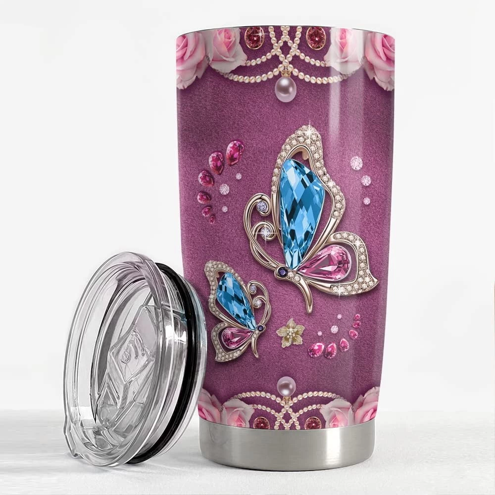 - Make hydration fierce with a glittering Tumbler featuring a powerful and majestic Butterfly design.