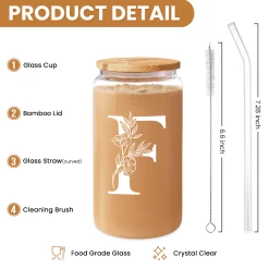 Monogram L Initial Glass Cup 16 Oz Can Coffee Cups With Lid And Straw – Gifts For Womens On Birthday