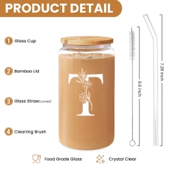 Monogram T Initial Glass Cup 16 Oz Can Coffee Cups With Lid And Straw – Gifts For Womens On Birthday