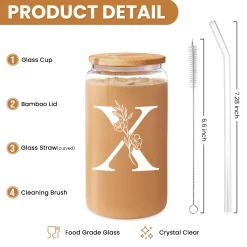 Monogram X Initial Glass Cup 16 Oz Can Coffee Cups With Lid And Straw – Gifts For Womens On Birthday