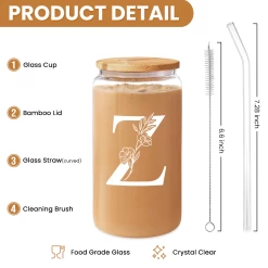 Monogram Z Initial Glass Cup 16 Oz Can Coffee Cups With Lid And Straw – Gifts For Womens On Birthday